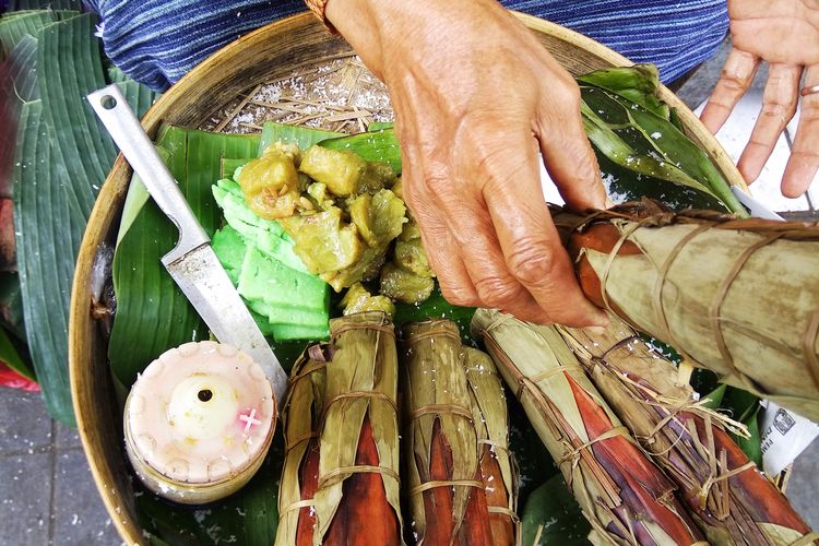 Penjual lopis di Pasar Gede, Surakarta, Jawa Tengah sedang menjajakan dagangannya pada Sabtu (6/3/2021)(KOMPAS.com / Alifia Nuralita Rezqiana)