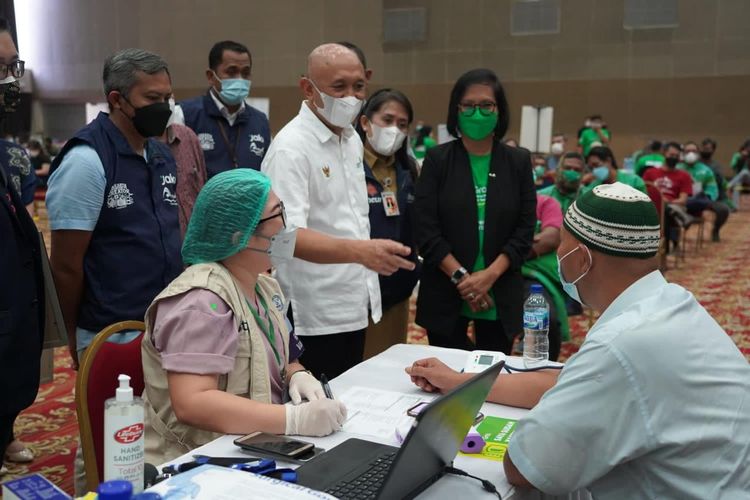 Menteri Koperasi dan Usaha Kecil Menengah mengunjungi acara Grab Vaccine Center (GVC) bersama KemenkopUKM dan Taman Impian Jaya Ancol di Allianz Ecopark, Ancol, Selasa (22/2).
