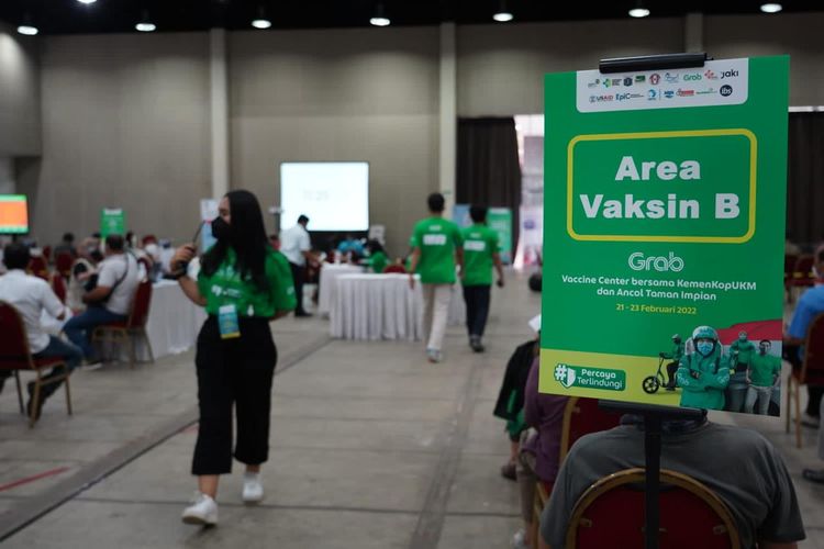 Grab Vaccine Center (GVC) bersama KemenkopUKM dan Taman Impian Jaya Ancol di Allianz Ecopark, Ancol, Selasa (22/2).