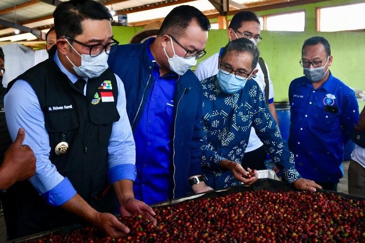 Acara Pelepasan Ekspor Kopi Binaan IPB University dan PT Astra Internasional Tbk di Garut, Jawa Barat, Rabu (2/3/2022). Acara pelepasan ekspor kopi ini juga dihadiri oleh Gubernur Jawa Barat Ridwan Kamil, Rektor IPB Arif Satria, Head of Social Engagement Astra Triyanto. Dalam acara ini juga dilakukan penyerahan secara simbolis bantuan sarana dan prasarana produksi kepada petani milenial Jawa Barat.(Dok. Humas KemenkopUKM)