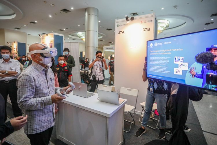 Menteri Koperasi dan Usaha Kecil Menengah (UKM), Teten Masduki meninjau Pameran dan Temu Bisnis Tahap Kedua Belanja Barang/Jasa Pemerintah untuk Produk Dalam Negeri dengan topik Teknologi Informasi, Komunikasi dan Digital di SMESCO Exhibition Hall, Jakarta, Senin (18/4).()