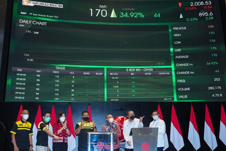 Menteri Koperasi dan UKM (MenKopUKM) Teten Masduki di Bursa Efek Indonesia, Jakarta pada Jumat (5/8/2022). PT Sari Kreasi Boga Tbk UMKM produsen kebab dengan merek Kebab Turki Baba Rafi kini berhasil melantai di Bursa Efek Indonesia (BEI).