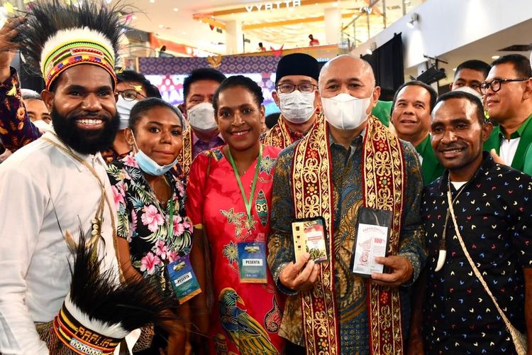 Menteri Koperasi dan Usaha Kecil Menengah (Teten Masduki) bersama para pelaku UMKM dalam acara Peringatan Hari UMKM Nasional di Cihampelas Walk, Bandung, Jawa Barat, Jumat (12/8/2022).
