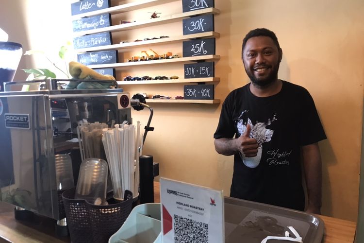 Pemilik bisnis Highland Coffee Roastery, Yafeth Wetipo (34) saat ditemui di kedainya di kawasan Jayapura, Papua pada Sabtu (23/7/2022). Yafeth dulunya seorang dosen dan kini ia menjadi pengusaha kopi sukses.