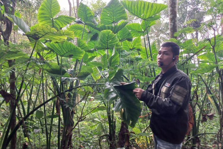 Warga menunjukkann umbi surinama sejenis talas ini pada zaman dahulu digunakan sebagai makanan pokok pengganti beras saat paceklik alias kekurangan pangan di Desa Gunung Wangi, Kaligesing, Purworejo, Jawa Tengah.