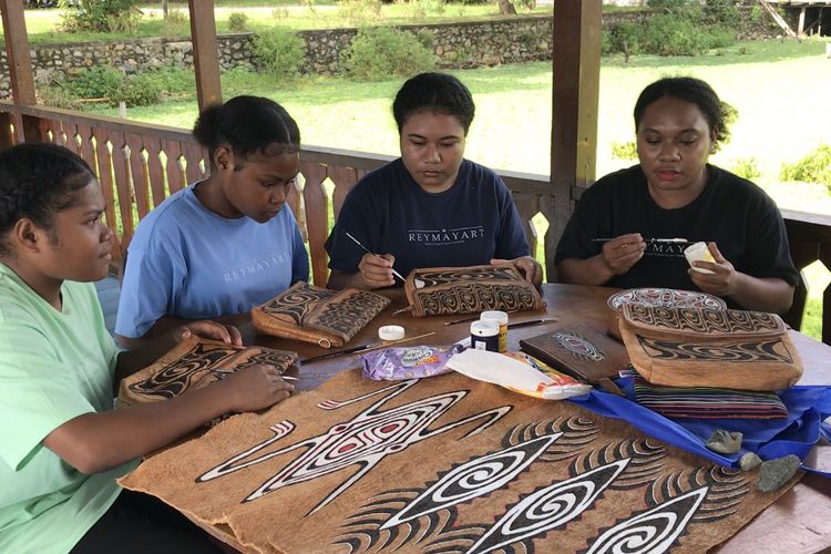 Serra Esterlin Ohee (24), pengusaha muda asal Pulai Asei Besar bersama para saudaranya memeragakan pembuatan kerajinan kulit kayu dari pohon Khombouw di Dermaga Pantai Khalkote, Jayapura, Papua pada Jumat (22/7/2022) siang. Serra yang juga merupakan Pegawai Negeri Sipil berstatus honerer membuat merek usahanya yakni Reymay Art.(KOMPAS.com/WAHYU ADITYO PRODJO)