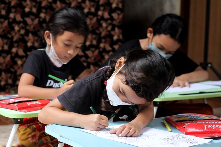 Sejumlah anak belajar melukis di Sinar Pande Rumah Wayang Kamasan, di Klungkung, Bali.