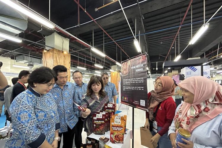 Ketua Umum Apindo Shinta W. Kamdani (tengah) saat melihat produk UMKM yang tergabung dalam Festival Apindo UMKM Merdeka Festival di Jakarta, Jumat (28/7/2023).