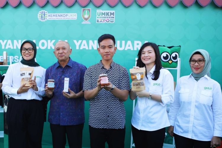 Menteri Kop-UKM Teten Masduki dan Walikota Solo Gibran Rakabuming bersama tim GoTo dalam acara live shopping Tokopedia Play.