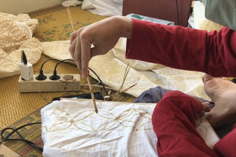 Penyandang disabilitas tuna daksa sekaligus anggota Sanggar Inspirasi Karya Inovasi Difabel (Sriekandi Patra) Darmawan Fadli Abdul Syukur (19) atau akrab disapa Wawan memegang kuas untuk mewarnai batik tulis buatannya di workshop di wilayah Dukuh Penjalinan, Desa Tawangsari, Boyolali, Jawa Tengah pada Rabu (26/7/2023). Sriekandi Patra merupakan sanggar binaan PT. Pertamina Terminal BBM Boyolali untuk membuka jalan para difabel untuk berkarya lewat batik. PT. Pertamina Terminal BBM Boyolali menghadirkan program Difablepreneur lewat Sriekandi Patra untuk meningkatkan taraf hidup para penyandang disabilitas di Desa Tawangsari melalui sektor Usaha Mikro Kecil Menengah (UMKM) Batik.