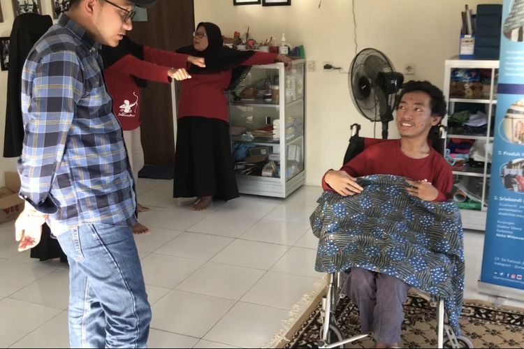 Penyandang disabilitas tuna daksa sekaligus anggota Sanggar Inspirasi Karya Inovasi Difabel (Sriekandi Patra) Darmawan Fadli Abdul Syukur (19) atau akrab disapa Wawan memamerkan karya batik tulis buatannya di workshop di wilayah Dukuh Penjalinan, Desa Tawangsari, Boyolali, Jawa Tengah pada Rabu (26/7/2023). Sriekandi Patra merupakan sanggar binaan PT. Pertamina Terminal BBM Boyolali untuk membuka jalan para difabel untuk berkarya lewat batik. PT. Pertamina Terminal BBM Boyolali menghadirkan program Difablepreneur lewat Sriekandi Patra untuk meningkatkan taraf hidup para penyandang disabilitas di Desa Tawangsari melalui sektor Usaha Mikro Kecil Menengah (UMKM) Batik.
