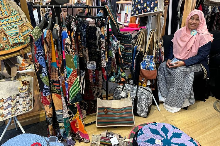 Penyandang disabilitas tuna daksa dan pemilik merek Mutiara Handycraft, Irma Suryati (48) menunjukkan produk keset dalam Pertamina Small Medium Enteprise Expo (SMEXPO) 2023 di Mal Gandaria City, Kebayoran Lama, Jakarta, Sabtu (4/11/2023). Irma adalah pelaku Usaha Mikro Kecil Menengah (UMKM) penyandang disabilitas yang diajak berpartisipasi oleh Pertamina dalam pameran Pertamina SMEXPO sebagai penerapan program Sobat Istimewa. Mereka mendapatkan stan untuk mempromosikan produk yang diproduksi oleh kelompok penyandang disabilitas.(KOMPAS.com/WAHYU ADITYO PRODJO)