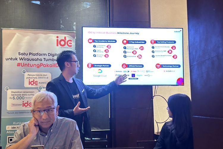 Director and Chief Business Officer Indosat Ooredoo Hutchison, Muhammad Buldansyah (kiri bawah) dan Vice President Building IDE for Small Medium Bussiness, Hadi Wijaya (belakang) menjelaskan soal program pemberdayaan Usaha Mikro Kecil Menengah (UMKM), Indosat Digital Ecosystem kepada wartawan di Jakarta pada Rabu (8/11/2023).(KOMPAS.com/WAHYU ADITYO PRODJO)