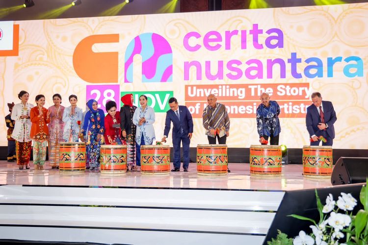 Penabuhan drum sebagai tanda pembukaan pameran Cerita Nusantara yang diikuti oleh Teten Masduki dan jajaran penyelenggara pameran Cerita Nusantara yang berlangsung di Jakarta Convention Center, Selasa (28/11/2023).