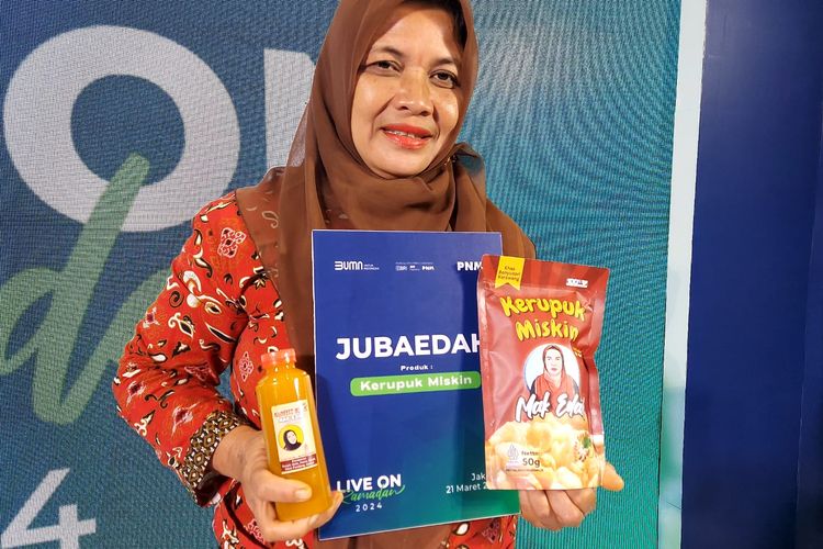 Jubaedah memegang produk Kerupuk Miskin dan jamu di sela-sela acara buka bersama PNM, Kamis (21/3/2024)