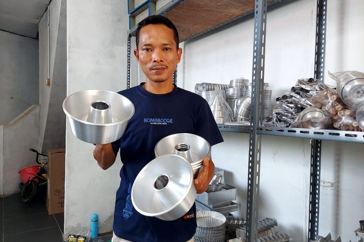 Munji (36) perajin perkakas logam dari Citeureup Kabupaten Bogor Jawa Barat memamerkan loyang cetakan kue produksinya