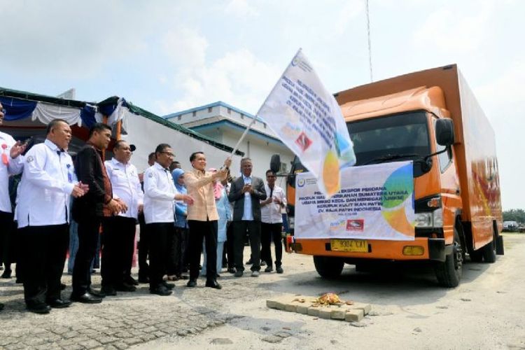 Penjabat Gubernur Sumatera Utara Agus Fatoni melepas ekspor perdana 2.500 kg kerupuk ikan patin ke Malaysia, di Kabupaten Deli Serdang, Rabu. (ANTARA/HO-Humas Pemprov Sumut)
