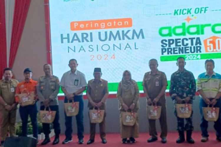 Penjabat Penjabat Bupati Tabalong Hamida Munawarah (kelima dari kanan) bersama forum komunikasi pimpinan daerah, mitra kerja dan salah satu pelaku usaha mikro kecil dan menengah (UMKM) saat pelatihan pada peringatan Hari UMKM Nasional, di Tabalong, Kalsel, Senin (19/8/2024). (Dok. Pemkab Tabalong via ANTARA)
